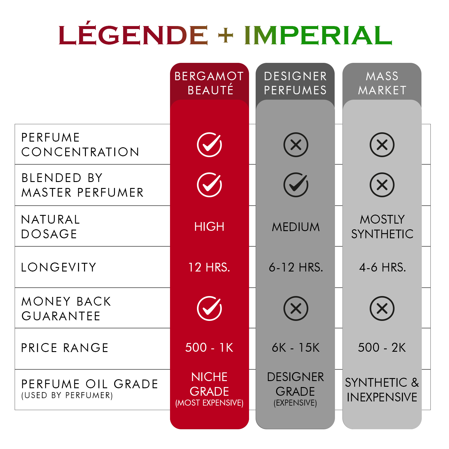 Legende - Cedarwood, floral, woody Imperial - Freesia, Lily of the Valley, Orris, Sambac Jasmine, Voilet, Ylang-Ylang