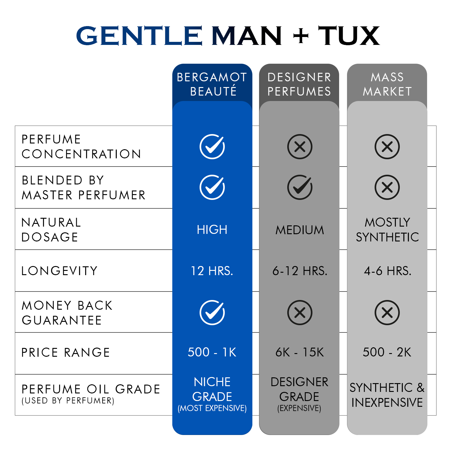 Gentle Man : Aromatic, Bergamot, Fresh, Lavender, Ozonic, Fresh TUX : Nutmeg, Pink Pepper, Cardamom, Grapefruit
