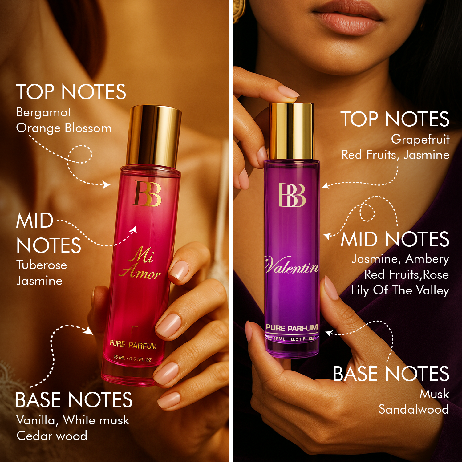 Valentine : Jasmine, Ambery, Red Fruits, Rose, Lily of the Valley Mi Amor : Rose, Jasmine, Ambery